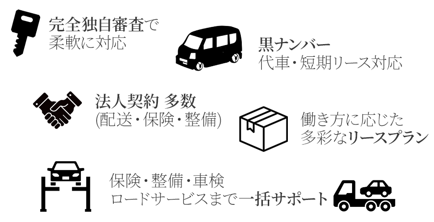 W-FINANCEは、車両を必要とする個人事業主、法人の皆さまに向けた、独自審査のリースサービスを展開しています。